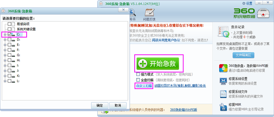 6、选择自定义扫描,选择系统盘“C盘”,按“开始急救”按钮;